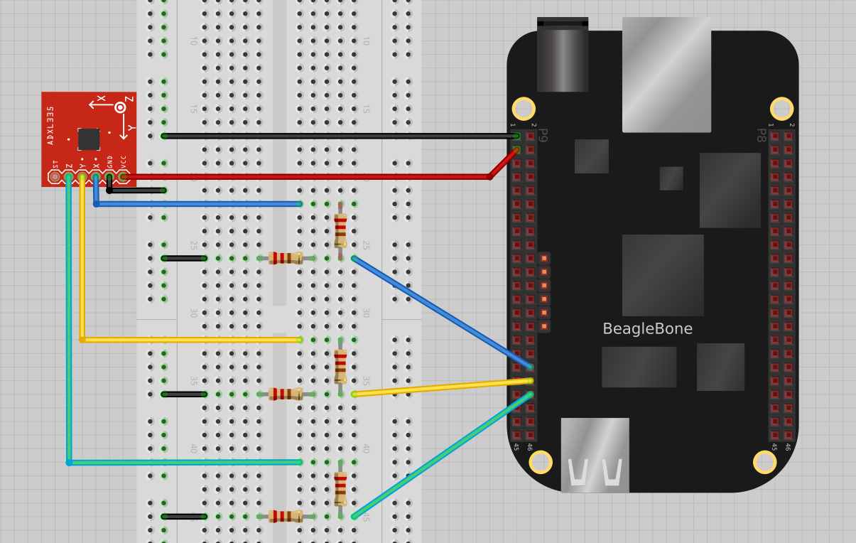 This example reads values from Sparkfun’s ADXL335 3-axis accelerometer. Because the output of the ADXL335 is between 0-3.3V and because BeagleBone's analogRead pins are 1.8V tolerant, we used a hardware (resistor) voltage divider on each of the accelerometer outputs. This provides a range of 0-1.65V to be read on BeagleBone analogRead pins.