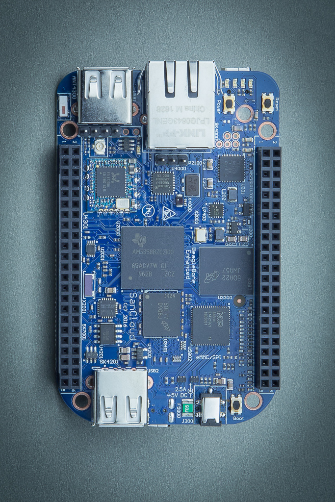 SanCloud BeagleBone Enhanced is a joint effort by BeagleBoard.org and SanCloud. It is based on the open-source hardware design of BeagleBone Black with upgraded Ethernet speed (gigabit), RAM (gigabyte), a USB hub, built-in sensors and a WiFi/Bluetooth option.