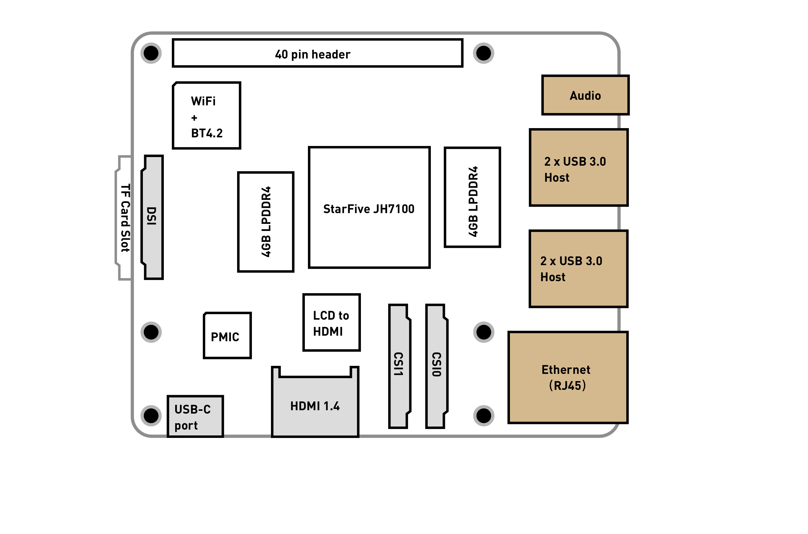 - • 40 Pin GPIO Header (28 x GPIO, I2C, I2S, SPI, UART)